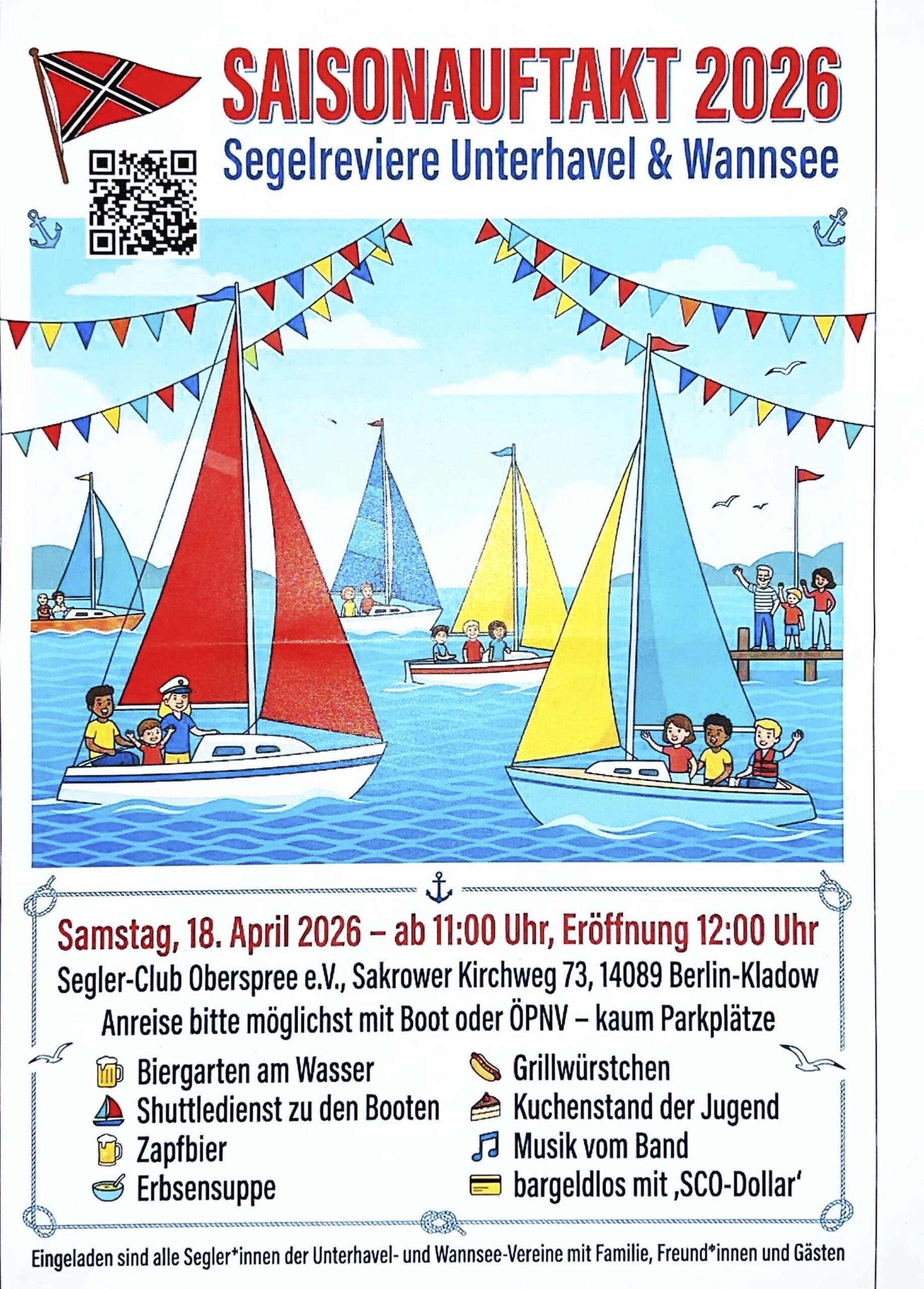 Los geht es um 10.00h am Flaggenmast auf unserem Vereinsgelände, im Anschluß (ab 11.00h) findet dann die Saisonauftaktveranstaltung der Segelreviere Unterhavel und Wannsee im Segler-Club Oberspree e.V. statt.